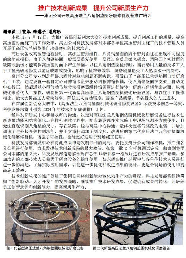 推廣技術創新成果 提升公司新質生産力 ——集團公司🏃🏻‍♀️開展高壓法蘭八角鋼墊圈研磨修